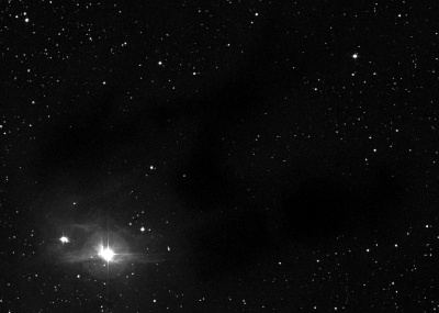 100/150mm - Tento Barnard se nachází hned vedle B27+B28. Vizuálně tyto 3 tmavé mlhoviny nejsem schopen od sebe rozlišit. Slévají se do jednoho tmavého chomáče. Zvětšení 36x. Petr