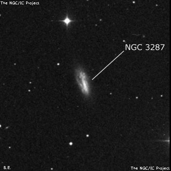 300/350mm - 13,1" slabá, rozptýlená, středně velká, protáhlá S-J, rovnoměrná jasnost povrchu. Jasné dvojhvězdy ∑1448 = 7,6/9,0 vzdálené 11" jsou 7' JZ. NGC 3301 leží 30' SV.
